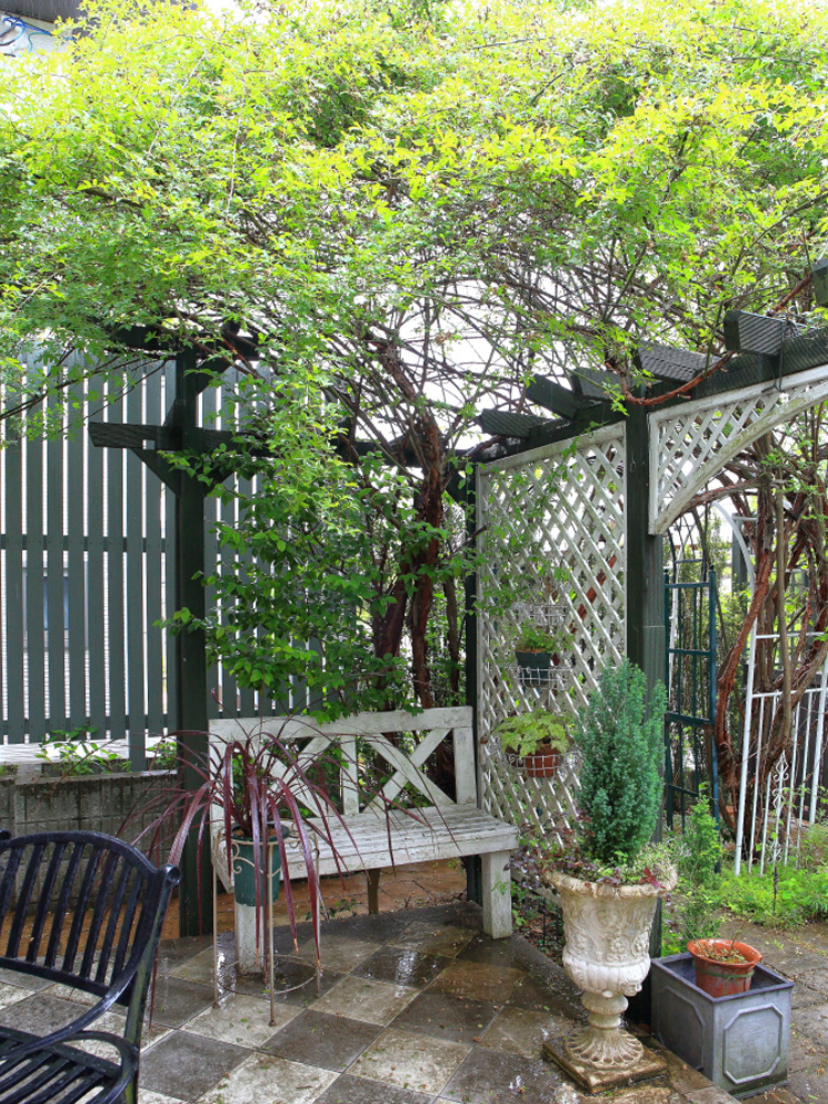 初代の庭から変わらない要素としては、リビングから続く居心地の良いテラスが挙げられます。 今、テラスの正面にはミモザの大きな木があり、早春には球根花が咲き、キモッコウ、モッコウバラ、ポールズ・ヒマラヤンムスク、カシワバアジサイ、アガパンサスへと季節感がリレーしています。 庭作りでは、企画演出は治代さんで、植物のメンテナンスは、夫の昌佳さん(59)が受け持ちます。ご近所に住む庭友だちとおしゃべりするのは、“晴れたらテラス”が皆さんのお気に入りのスペースになっています。