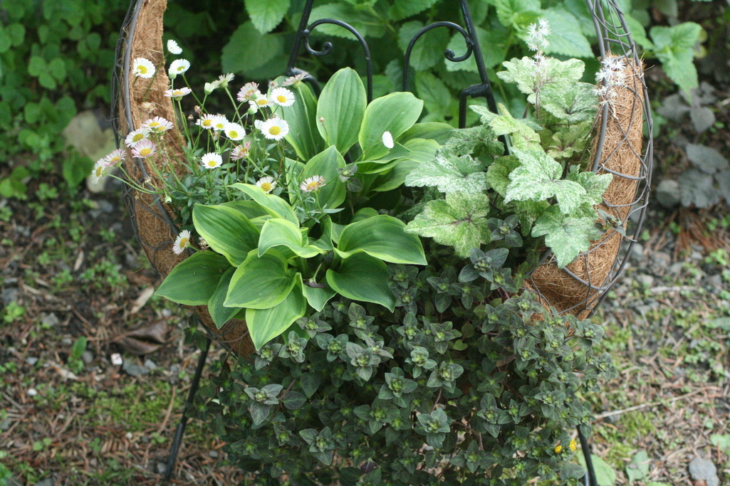 どどさんてこういうアイデアがどんどんあふれてくるのかな?葉物中心の寄せ植え、いいですね。私、これと同じ三日月型のハンギング持ってるけど、使いこなせず物置の中・・・これ真似させてね。