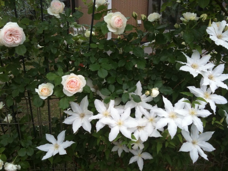 ホワイトガーデンですね~バラとクレマがマッチ素敵な空間ですね。実は私、随分前にピエールを抜いちゃった経歴ありです。(大変でした^^) なのにブランピエールは育てたいな~と思うのです。(^^ゞ このように綺麗なら尚更気になります!!