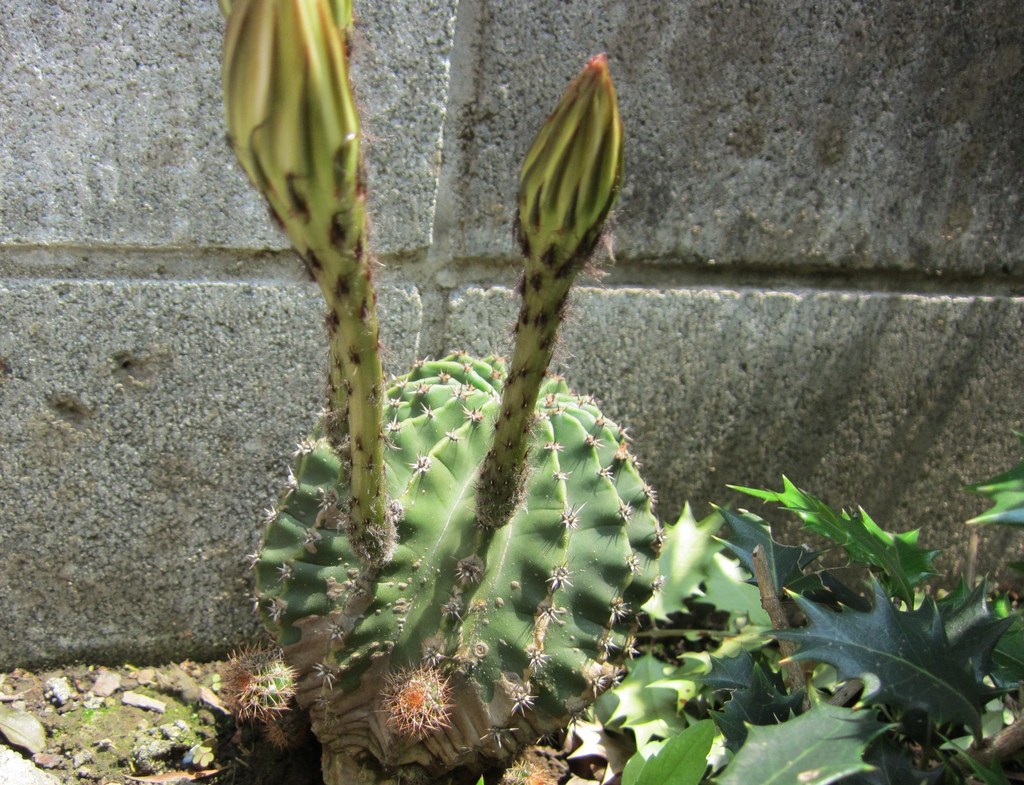 これが花が咲く前日のサボテン、蕾の姿です。母曰く、誰かが勝手にここに置いていったみたいで、でも棘があるから触れずそのままにしてたらこんなになっちゃった・・・そうです。