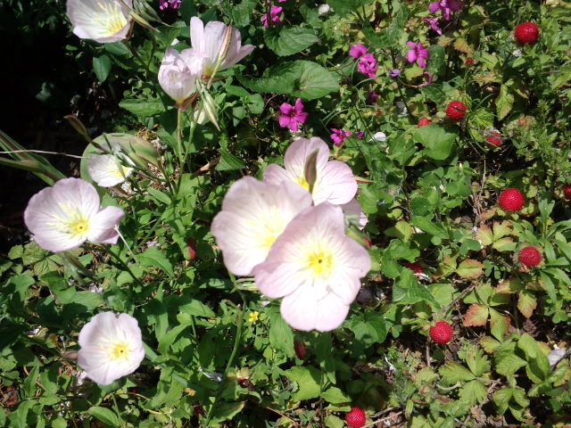 ヒルザキツキミソウ(昼咲き月見草) と ベニカタバミ(紅片喰) と ヤブヘビイチゴ(藪蛇苺)