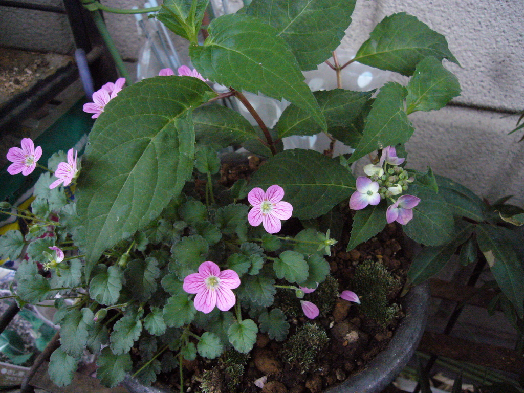 山アジサイは径3センチほどです。2年ぶりに花が咲きうれしい!ビニール傘がうつりこんでしまいました‥