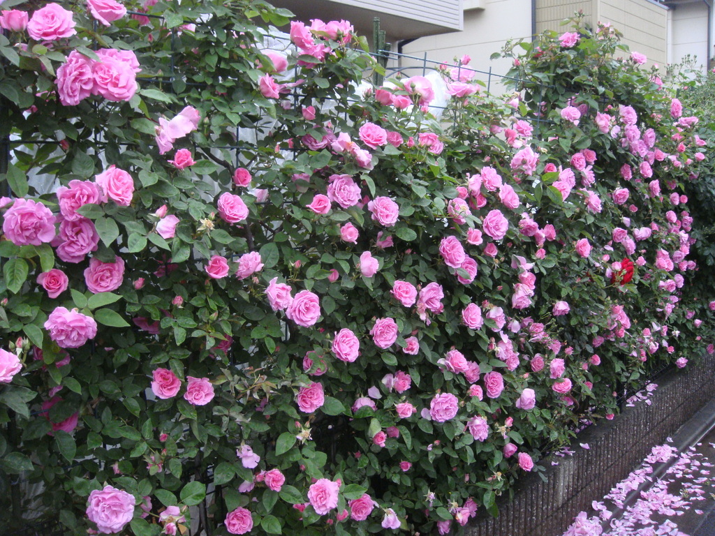 毎年、東西に約10メートルのピンク色のカーテンができます、周りにオールドローズの香りを放ちます、散歩道のひとつになってます。
