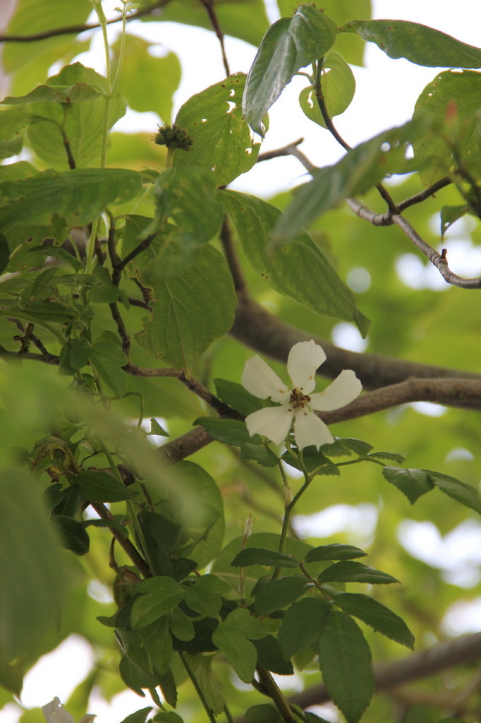 ハナミズキの木に絡ませたいウェディングデイ。一番綺麗な時に撮りそびれて、しべが茶色になってしまったけど、控え目で素敵なバラなんですよ。
