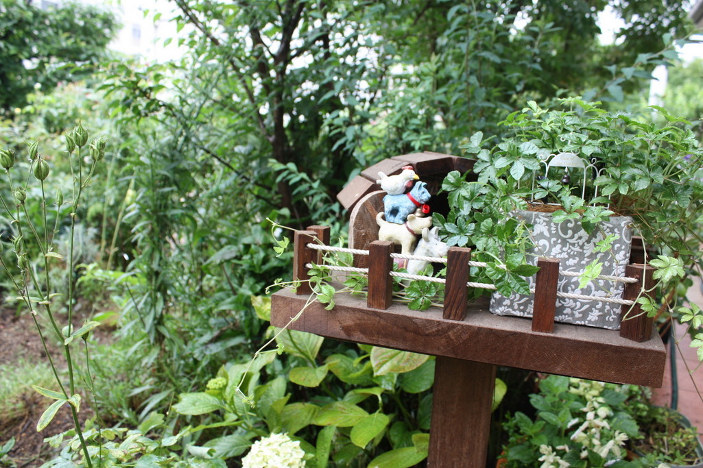 お客様が来るときは庭の隅に音楽隊をセットしておきます。これを見ると皆さんけっこううけます。バラが終って見せるものがないので苦肉の策です。