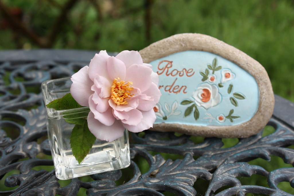 可愛いです~♡ちょっと椿のような花芯が特徴あるバラですね。石のプレートとぴったりですね!こんな風にちょこっと小さい花瓶に飾るの好きです。