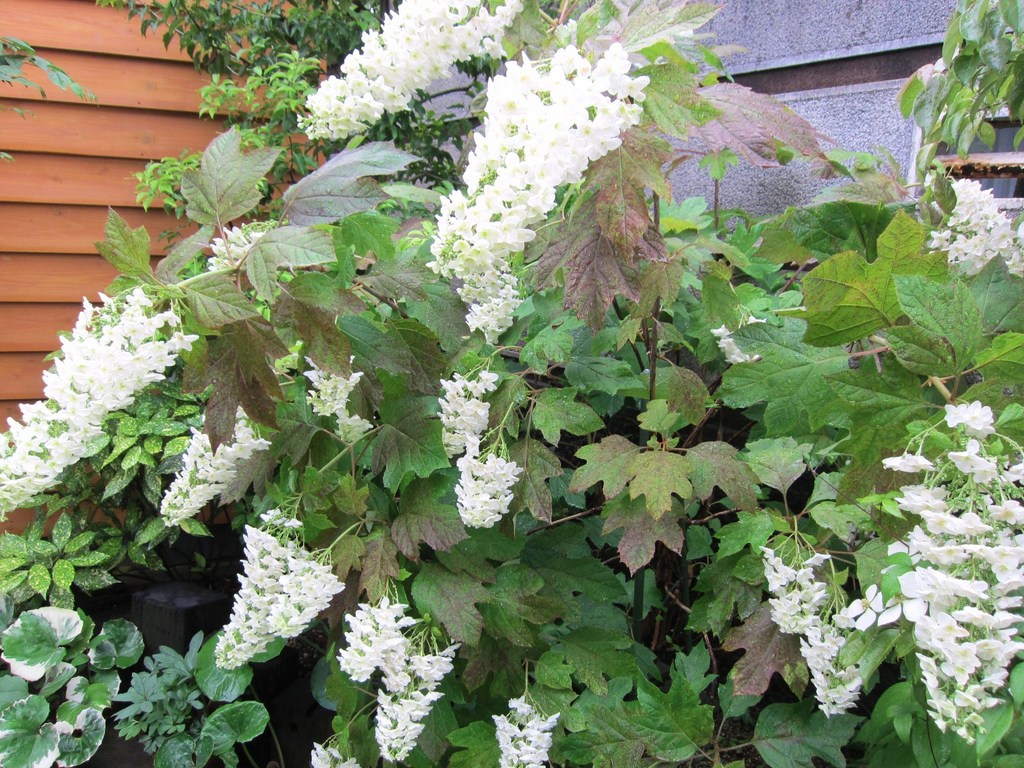 今日の大雨で柏葉あじさいの花穂がすっかりうつむいてしまいました。う~ん、頑張れ!