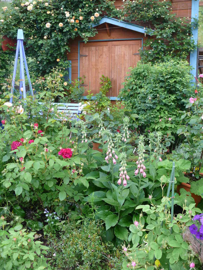 こちらの庭は3~4年目、育ち良すぎてどうしよう・・・奥の黄色はクラウンプリンセスマルガリ-タ、手前の赤はシェイクスピア2000。