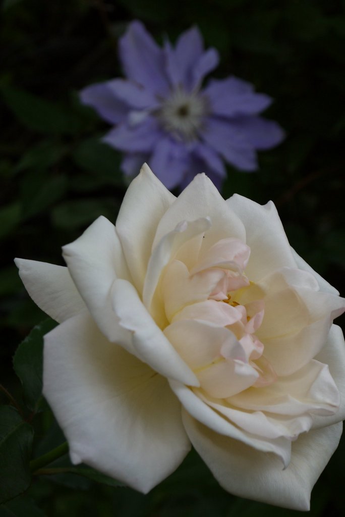 大輪のティーローズは、木陰でスーッと伸びたステムの先に楚々と咲くんです。画像奥にはクレマの夢御殿が偶然写っています。