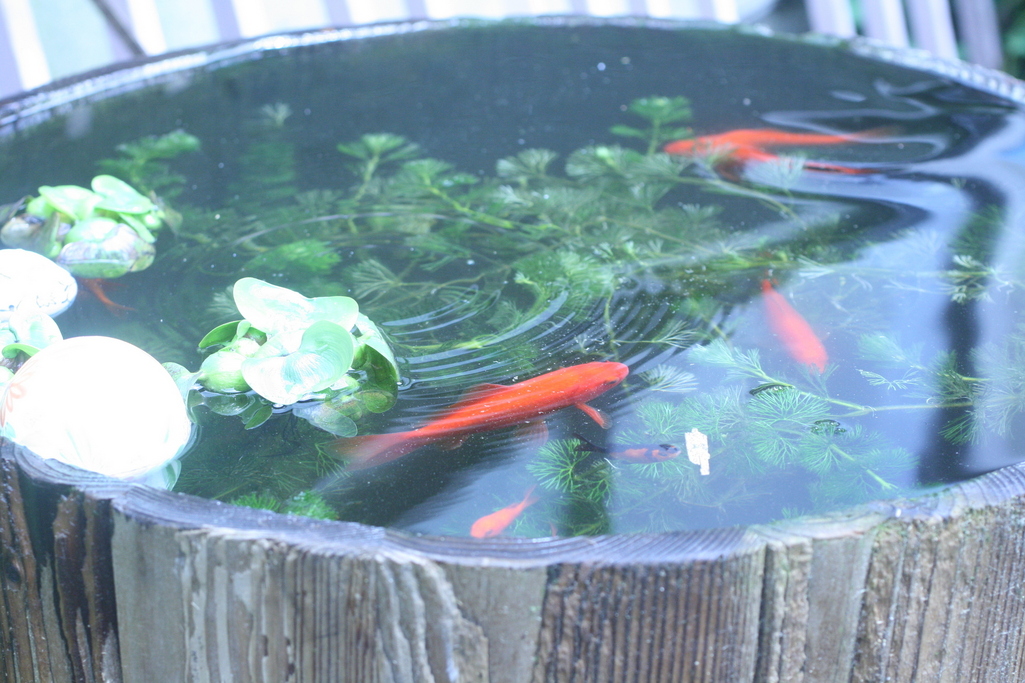 どどさんの手にかかると味噌樽もとってもいい感じの金魚鉢になっちゃいますね。・・・しかし、こっそりと?いいんですか~・・・?金魚たち気持ちよさそうに泳いでるから良しとしましょう!^^