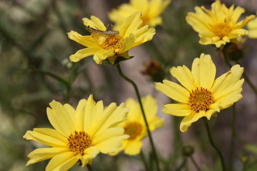 コレオプシス、クリームブリュレの花の上で獲物を待つ?カマキリさん。こちらは30センチくらいだけど、虫は高いところこわくないのかしら?