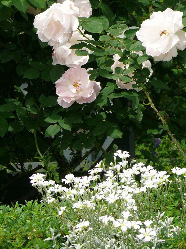 ピンクのピ-チブロッサムはしだいに白く変化します、足元のセラスチウムと白で合わせてます。