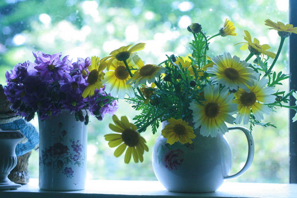華やかな窓辺に大変身、光加減が絶妙です、使っている花瓶もナイスコ-ディネイト。