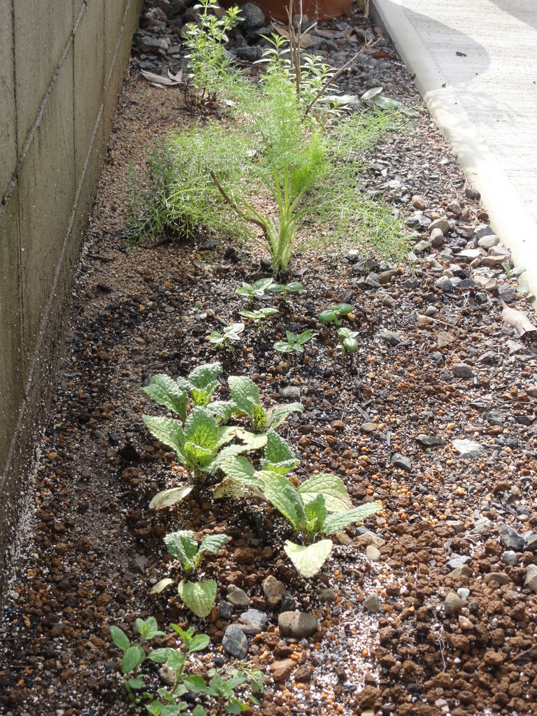 我が家のガレージの隙間にとっても小さなハーブ畑をつくりました。マジョラム・ボリジ・バジル・・・は種を捲きました。