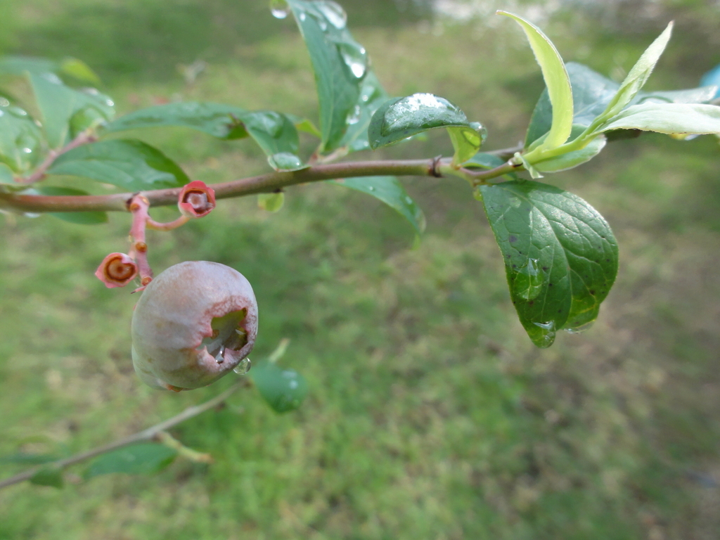 我が家にもブルーベリーの実がつき始めました。さぁ、小鳥が早いか、子供たちが早いか。
