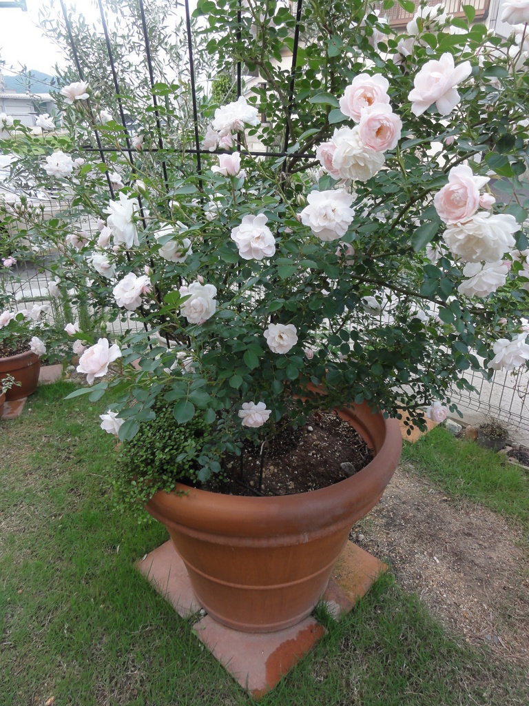 鉢の大きさを感じさせないくらい立派に咲いていますね~♪ ツルバラだからってこだわらなくてもいいんですね。