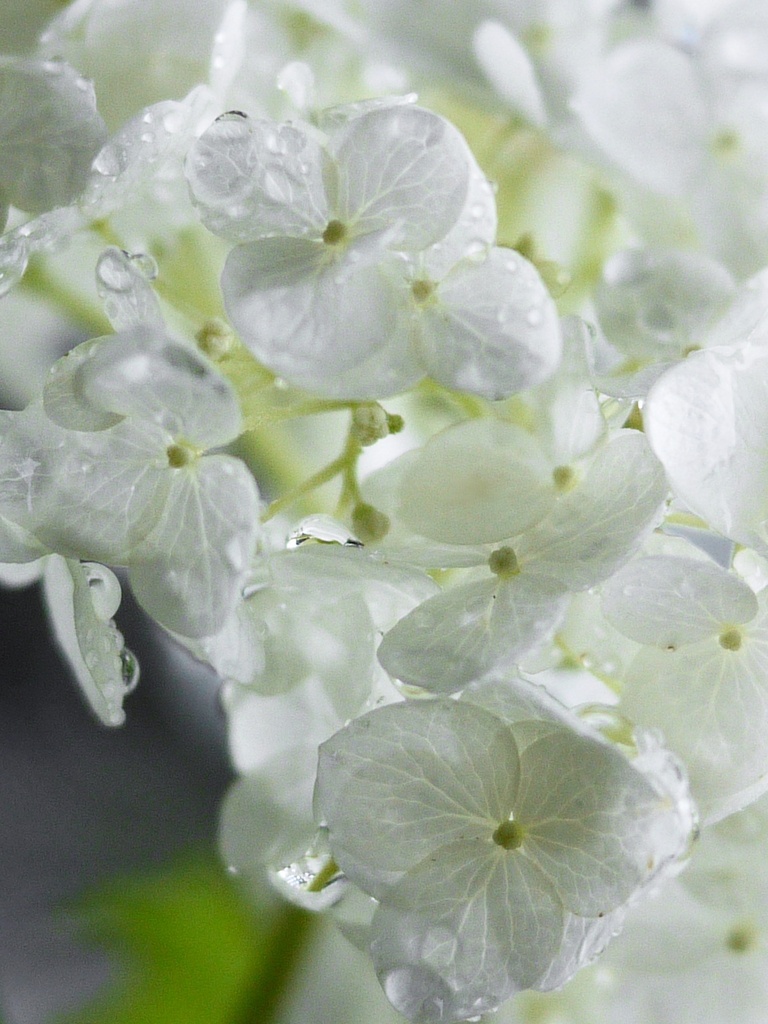 いや~、綺麗な写真ですね~。純白のアナベルから滑り落ちそうな水滴。