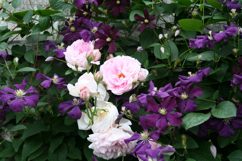 このバラとクレマチスの組み合わせ好きです。随分たくさんの種類のバラがあるんですね、どれもとても綺麗に咲いていて素晴らしいですね。