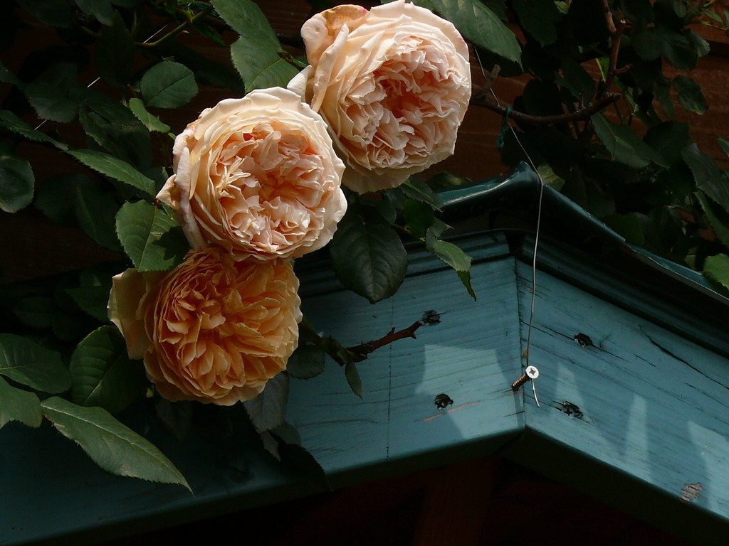 小屋の上のオシャレなバラは何と言う名前?と毎年聞かれるバラです、そういえば知り合いの人の家で見たこと無いな~(クラウンプリンセスマルガリ-タ)
