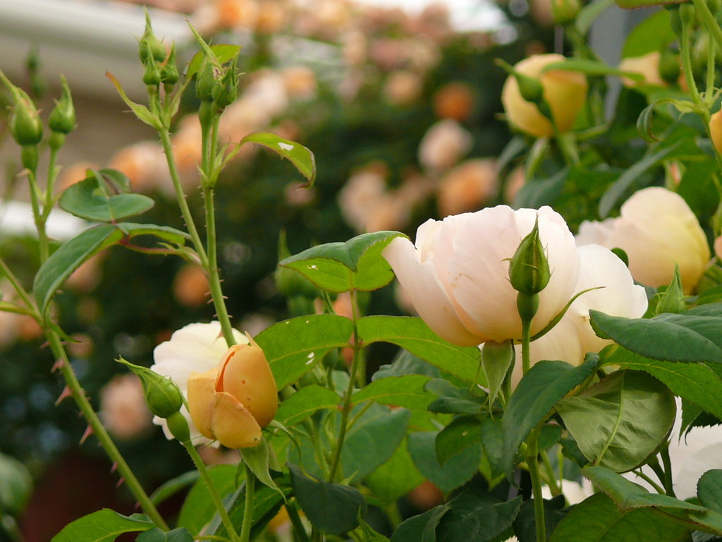 ERコンテドゥシャンパ-ニュ、黄色い蕾が開き徐々にピンクのような淡いアプリコットのようなシャンパン色に咲き、ひらひらと散ります、元気の中にも美しさと大人を感じさせてくれる品種です。