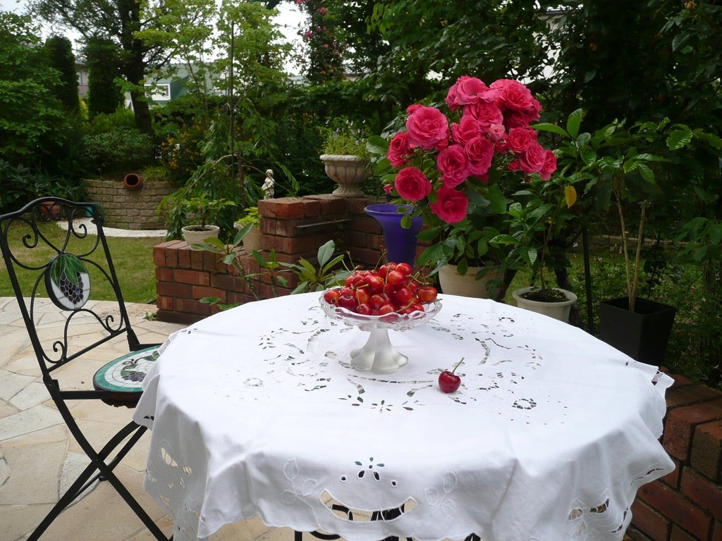 真っ赤であまーいさくらんぼちょっとおしゃれに庭の薔薇といっしょにとってみました。