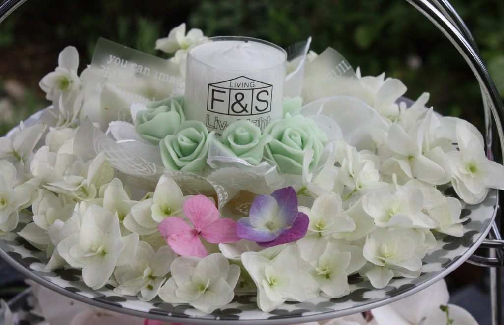 アジサイの花びらも このようにデコレーションするとバラに劣らず豪華ですね。キャンドルに火をとともしてみた~い。(^_^;)