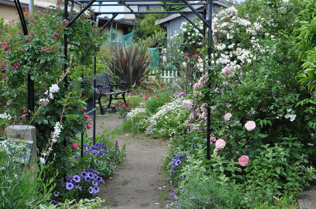 ラベンダーやミントなど、香りも感じられそうな小道ですね。ガウラやペチュニアが、いっそう華やかさを増すことでしょう。