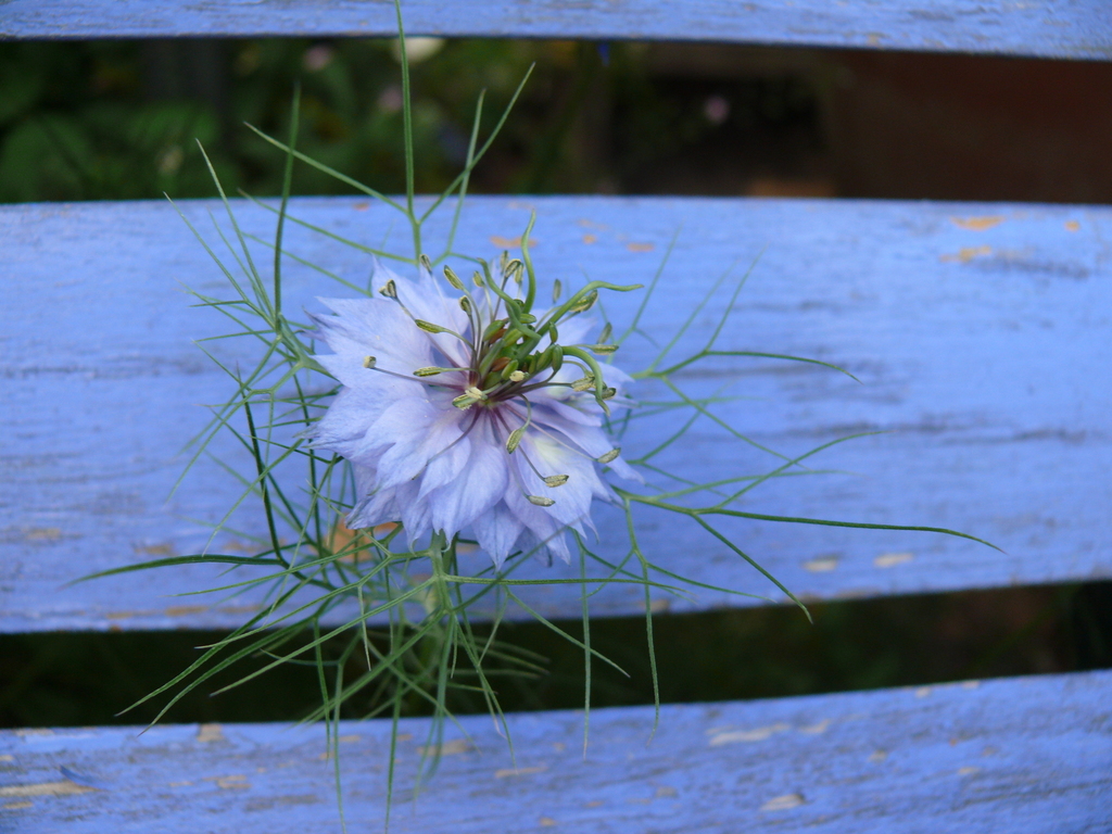 相変わらず色彩感覚が素晴らしいですね、絵画のょうな写真だと思いました。ベンチとニゲラノ花の色が微妙に違い、色のハーモニーを感じ、ベンチの横木が写真に緊張感と締まりを与えていると思います。素晴らしい。