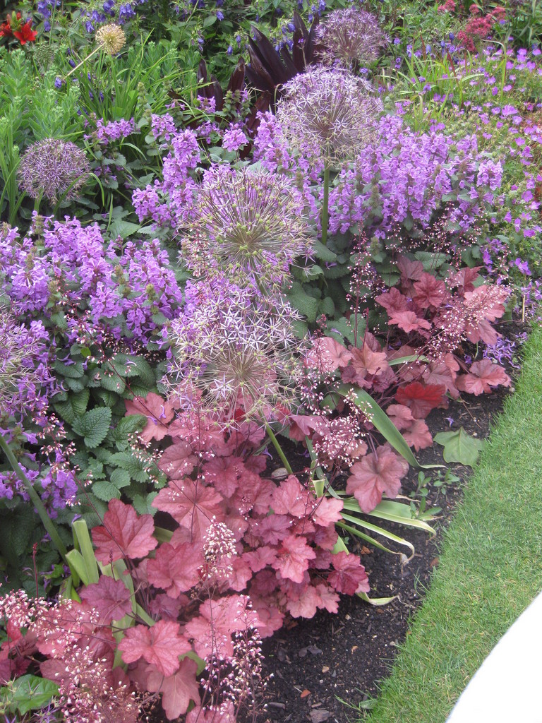 この色合わせは意外ですけどとてもいいですね。ヒューケラの小さい花がたくさん咲いて雰囲気のある素敵なボーダーになっていますね。