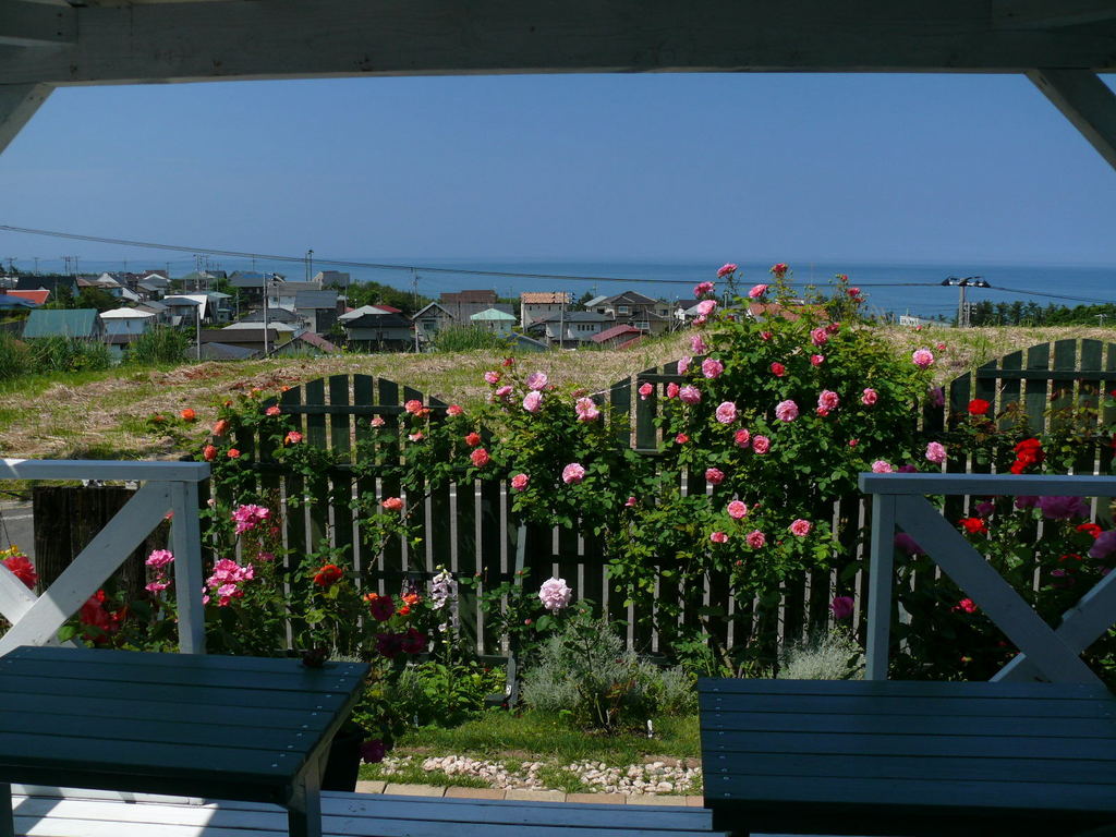 こんな素敵なデッキで朝ごはん、最高ですね^^!バラと空の青と海の青が絵になりますね~☆