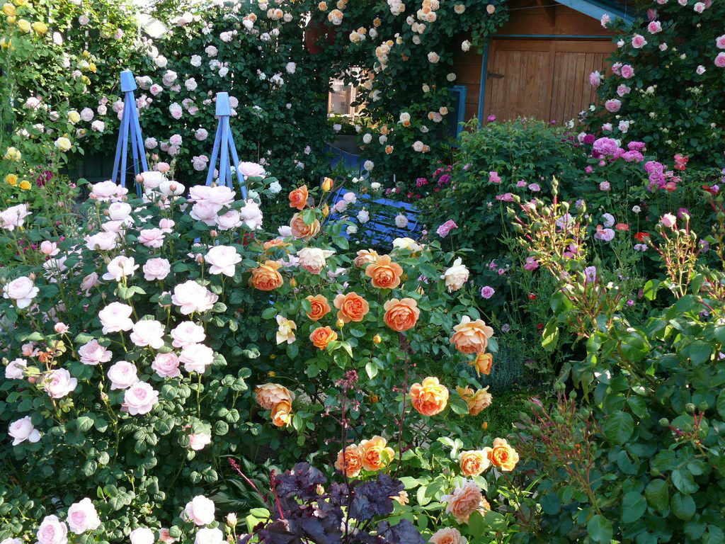 青の色が満開の薔薇たちを一層引き立てていますね。後ろの小屋の青の部分の色もご自分で調合されたのですか?