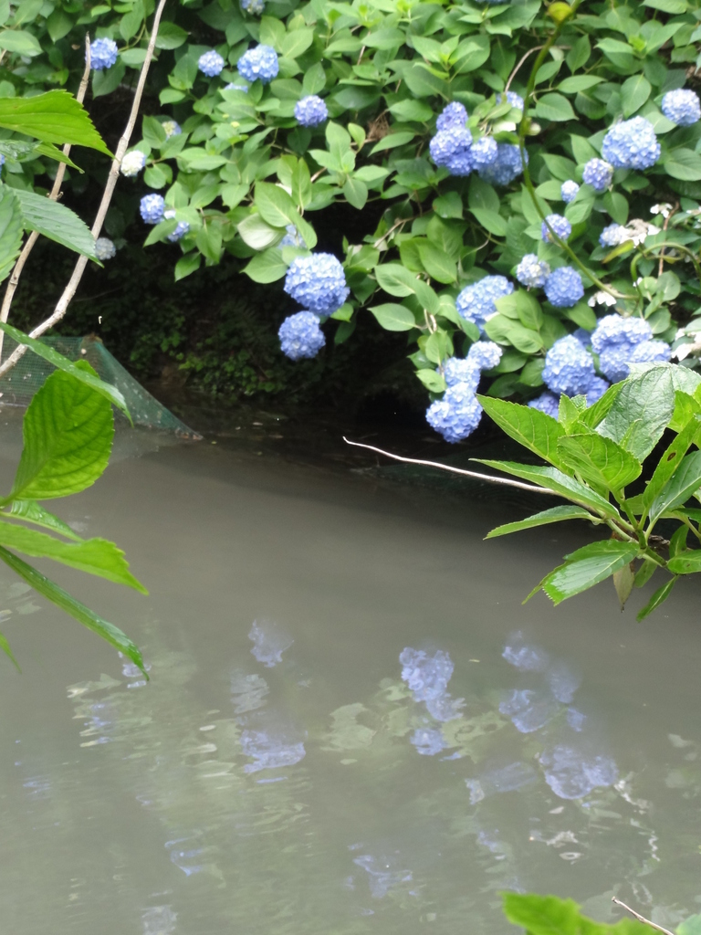池に写るあじさいも美しいです。