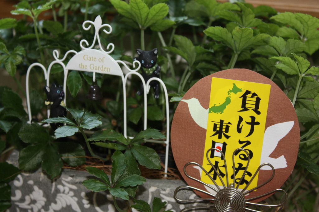 震災の地にささやかなプレゼントを贈ったら、ご丁寧にお菓子をくださいました。お菓子に貼ってあったシールを切り抜いて飾っています。左のガーデンピックも仙台にお住まいのブロ友さんのプレゼント。いつでも忘れないように飾っています。シュガーバインの緑もさわやか。