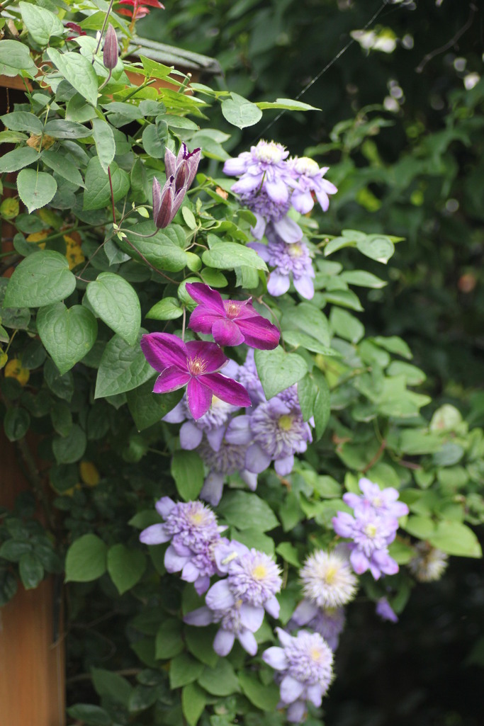 綺麗に咲いていますね。2種類のクレマチスの色が落ち着いていて大人な感じですね。