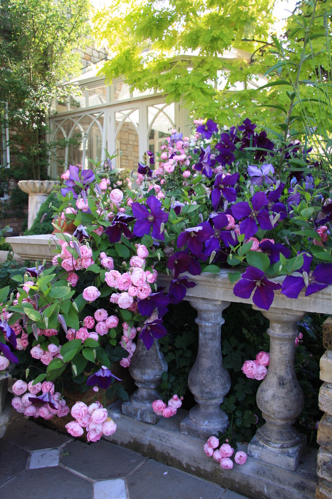 バラとクレマチスのコラボレーションが見事です。バックの光もいいですね。