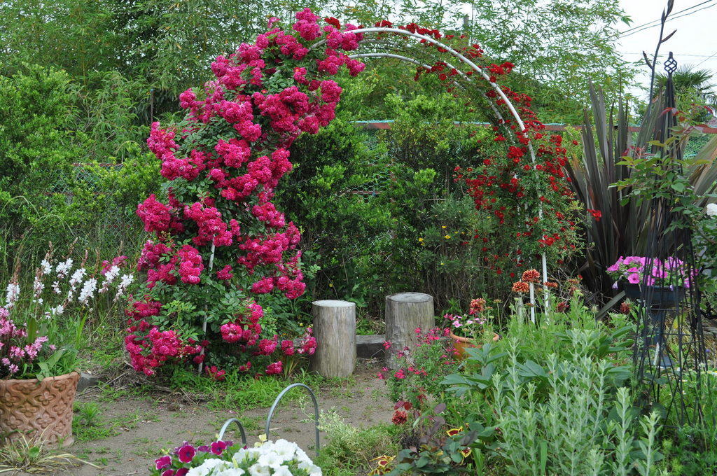 すてきなアーチですねっ!赤いバラの横の巨大生物?がとってもいい脇役で、素敵です^^