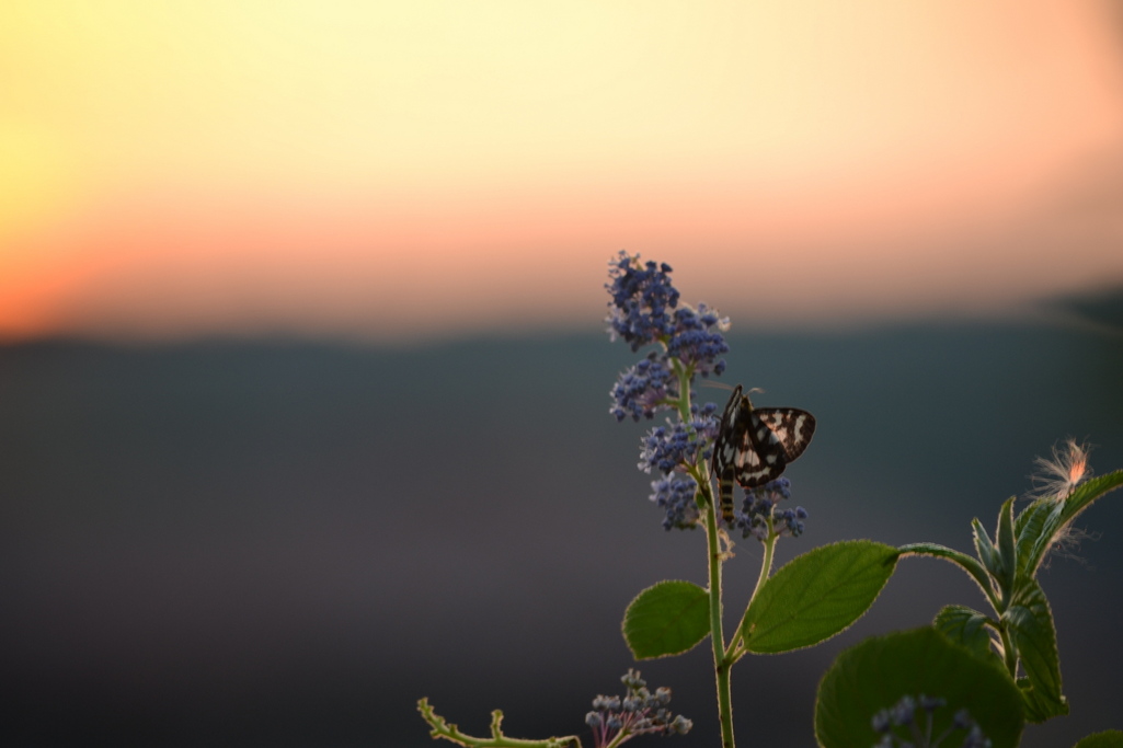 すてき!!狙っても撮れない瞬間ですねっ!!! 夕暮れと、花と蝶の美しいコラボにため息が出ちゃいます。