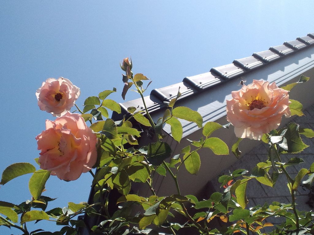 アーチに誘引したロココの2番花です。優しい花色に誘われて、ミツバチもやってきました。