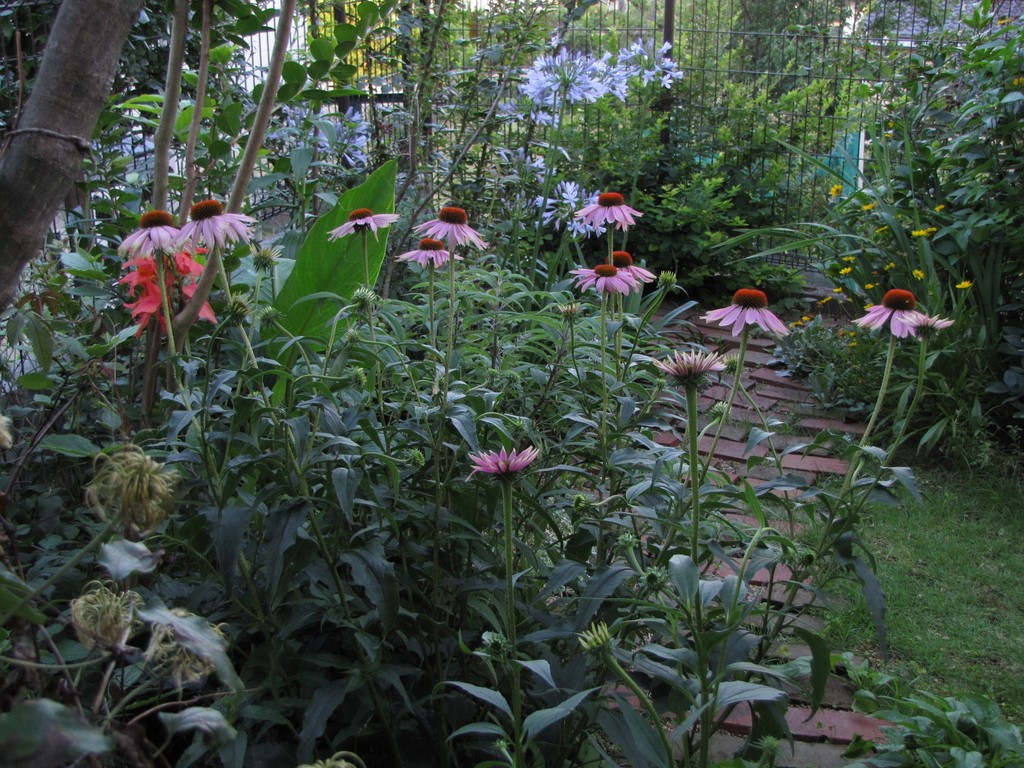 エキナセアとアガパンサス、カンナも咲いていますね。まさに初夏の風景ですね。