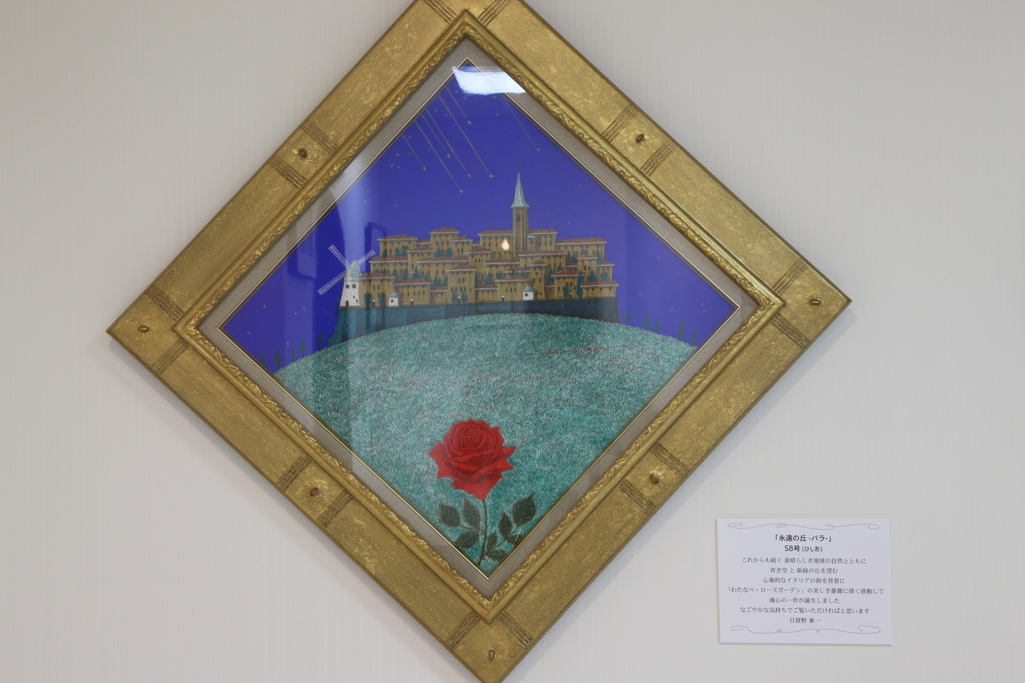 私の庭に訪れた絵描きさんから「バラの絵を描きたい」と言われたので花をあげました。翌年、画廊で画伯のバラを描いた一連の作品を見ました。ペンテル画だそうです。とりわけブルーがきれいで、一番気に入ったものを購入して飾っています。