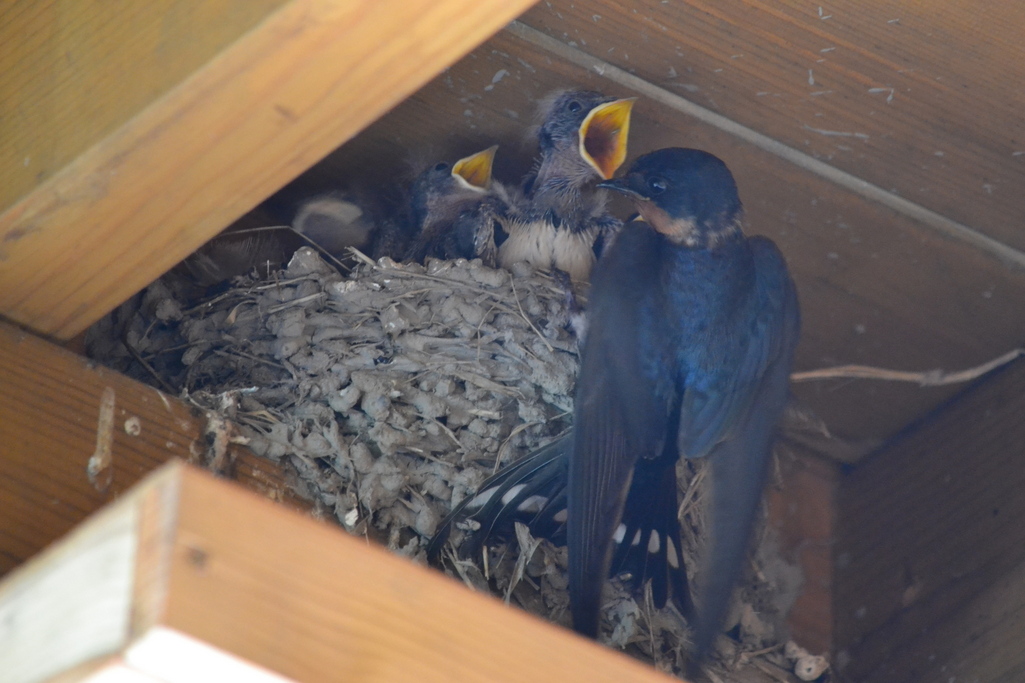 ナイスショットですね!!!ヒナがおっきな口をぽっこりあけてかわいい~(*^^*) 快適なbelugaさんの軒下を間借りして(板の出っ張り・・・ひょっとしてツバメのために棚を作ってあげています?)すくすく大きくなってくれるといいですネ。