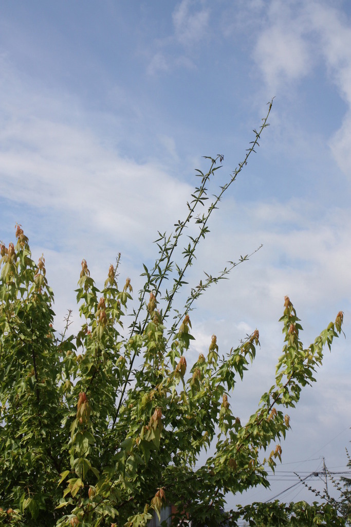 トウカエデ、花散る里の向こうから空に伸びるモッコウバラの枝・・・元気なのはうれしいけど、どこに誘引すればいいのか・・・