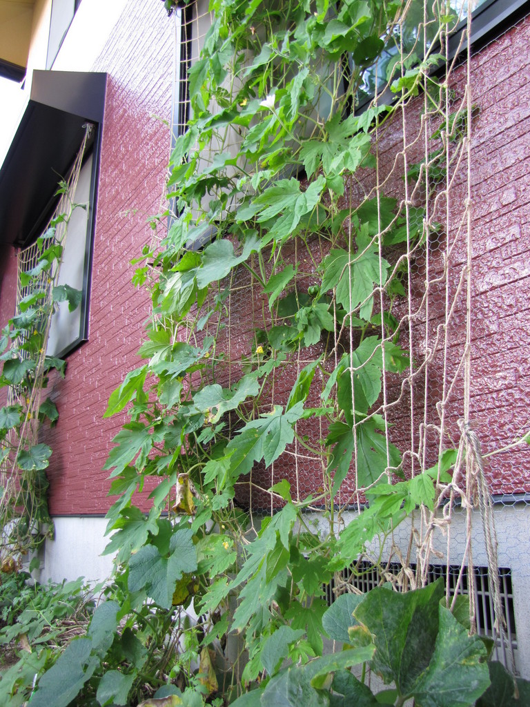 エコカーテンですか!立派に育ちましたね。ゴーヤはよく聞きますが、きゅうりも誘引されているのですね。収穫が楽しみですね。