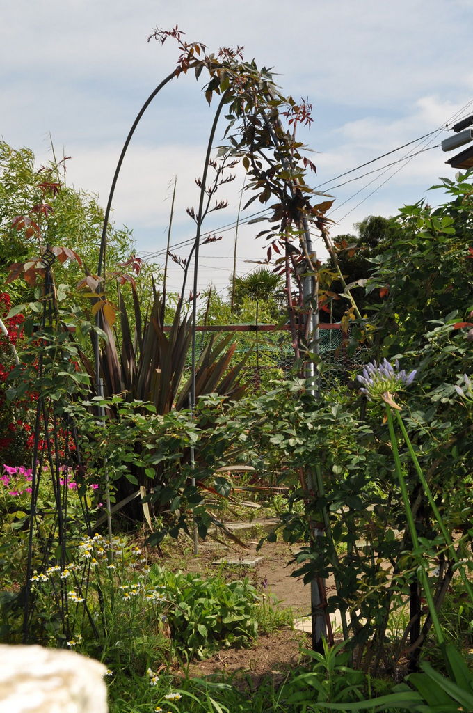 銅色のニューサイランの花 対 銅色のトレジャー・トロープのシュート。ただ今、高さを競い合っています。