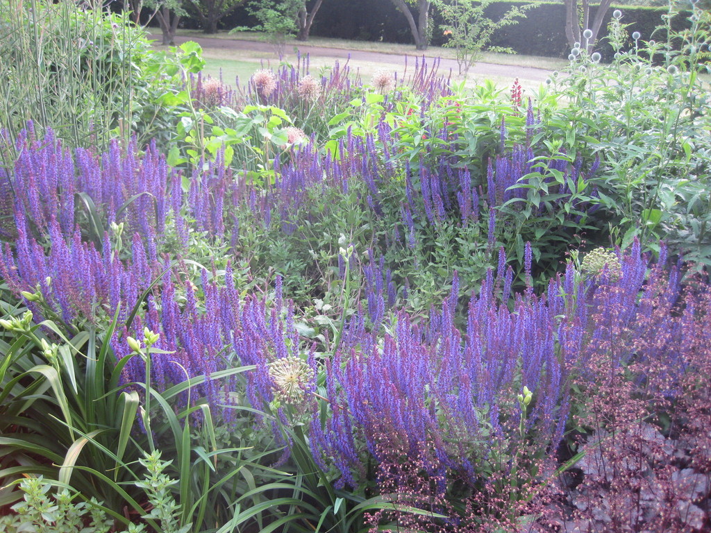 憧れのイングリッシュガーデンの数々、素晴らしいですね。緯度の関係でしょうか・・発色が違うし花期も長そう。エキノプス?がリズミカルでかわいいですね。青い花はネモローサでしょうか。群植すると圧巻ですね。