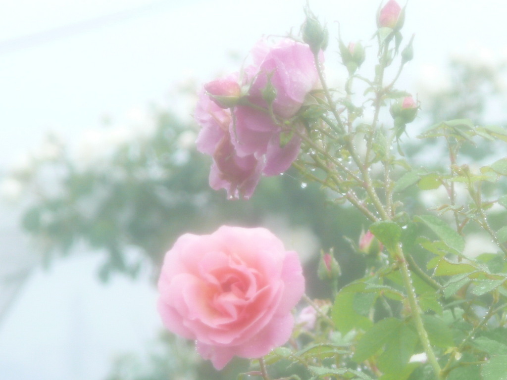 薔薇をとらえた写真と思いでしょうが、薔薇は脇役です、逆光ぎみの霧が撮りたくでできた写真です、霧じたいが光で反射して空気が眩しく輝いているようでした。上手く伝わるかな~?