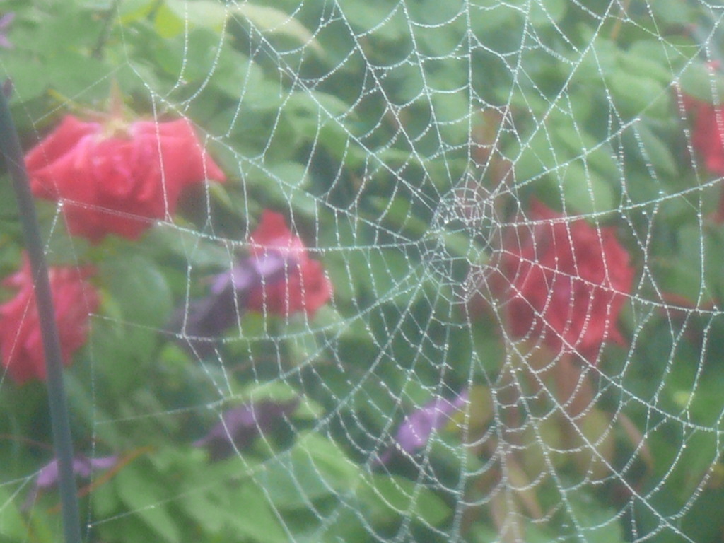 わぁぁぁ。これぞスパイダーマンのWEB、完璧な蜘蛛の巣ですね。ついた水滴がキラキラして、バックの薔薇の赤にひきたれられて、最高です^^! 朝からいいもの見させていただきました。ありがとうございます(*^^*)