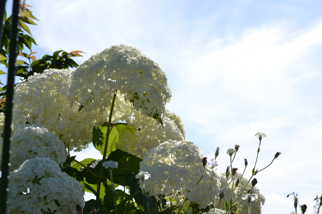 映ってはいませんが、横に愛犬がいます。何を見上げて見ているのかと愛犬目線になって見ると、風で揺れているアナベルを見ていました(^0^)