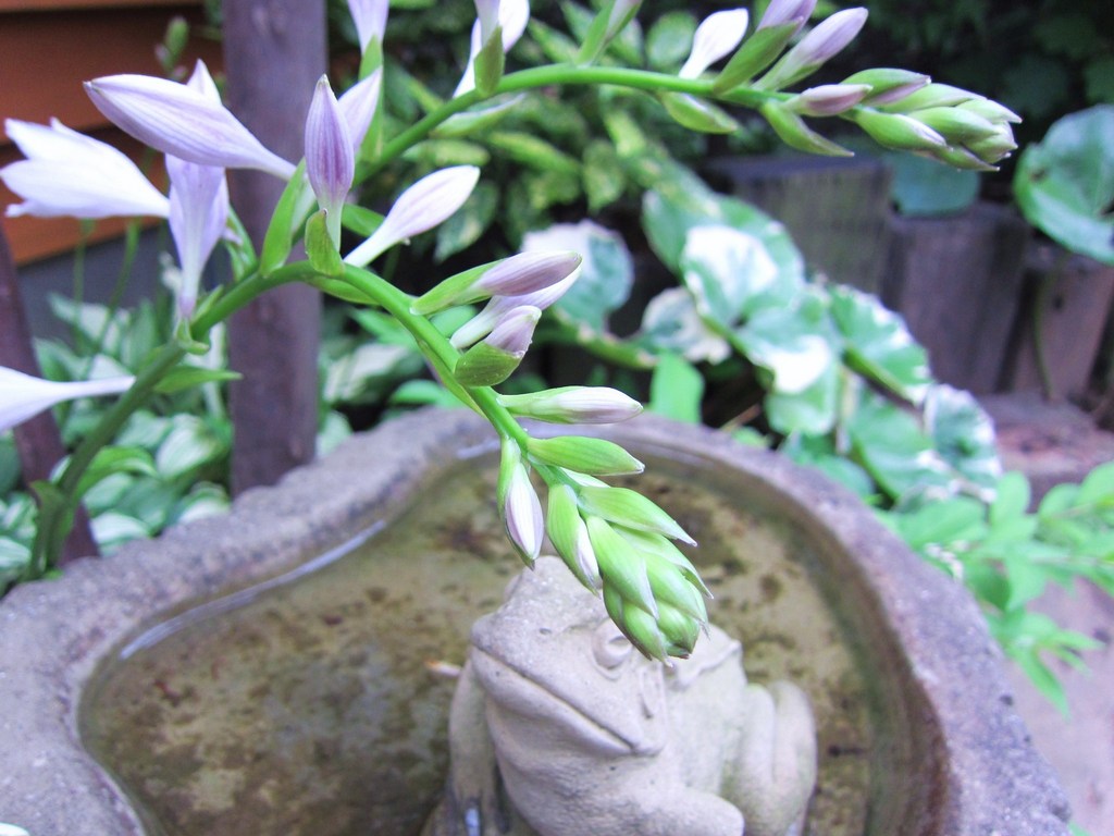 花を見つめるカエル、ナイスです☆ 水浴びしながら、「この花にゴハンが飛んでこないかな~」なんて考えてるかもしれませんネ。