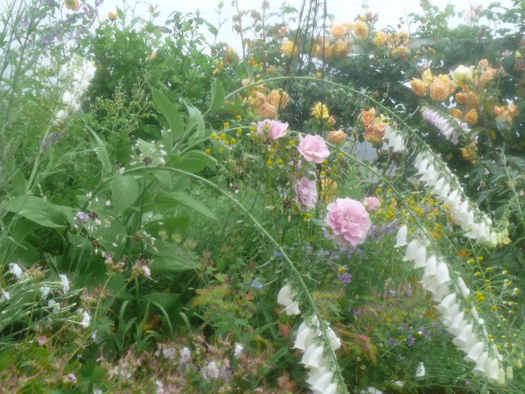 元気に伸びてたジキタリスも霧&雨でお辞儀状態、でもこの弓なりも2011年度の立派な自分の庭風景と思い撮影。案外よくない?